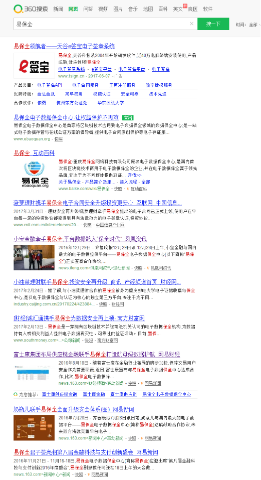 近日我公司(重庆易保全网络科技有限公司)工作人员 ,在360搜索引擎中搜索易保全关键词时发现我公司“易保全”这一专用名词被其他竞争对手及不良商家恶意竞价,致使我公司注册用户及潜在用户无法准确搜索到我司网址,此行为已经严重影响我司声誉及正常经营活动。我公司针对相关事宜特做出如下声明: