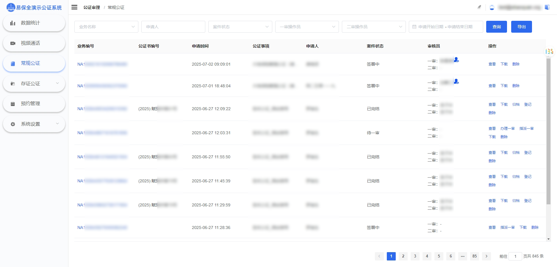 易保全网络公证系统基于区块链、电子签章等技术,将公证流程线上化、高效化,切实打破了传统公证受地域、时间限制的壁垒,将传统公证的“线下跑腿”转化为“线上直达”,并支持多智能终端、私有化部署、定制化开发等对接方案,完美契合政务服务智能化升级的需求。