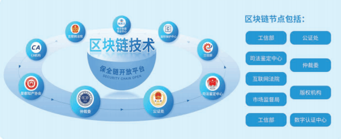 保全链平台是易保全利用区块链技术结合自有发明专利,联合公证处、仲裁委、司法鉴定所、法院、版权保护中心等众多权威机构组建的联盟区块链,将电子数据从产生那刻起,即固化存证到保全链,可实时在线查验、司法出证和举证维权。