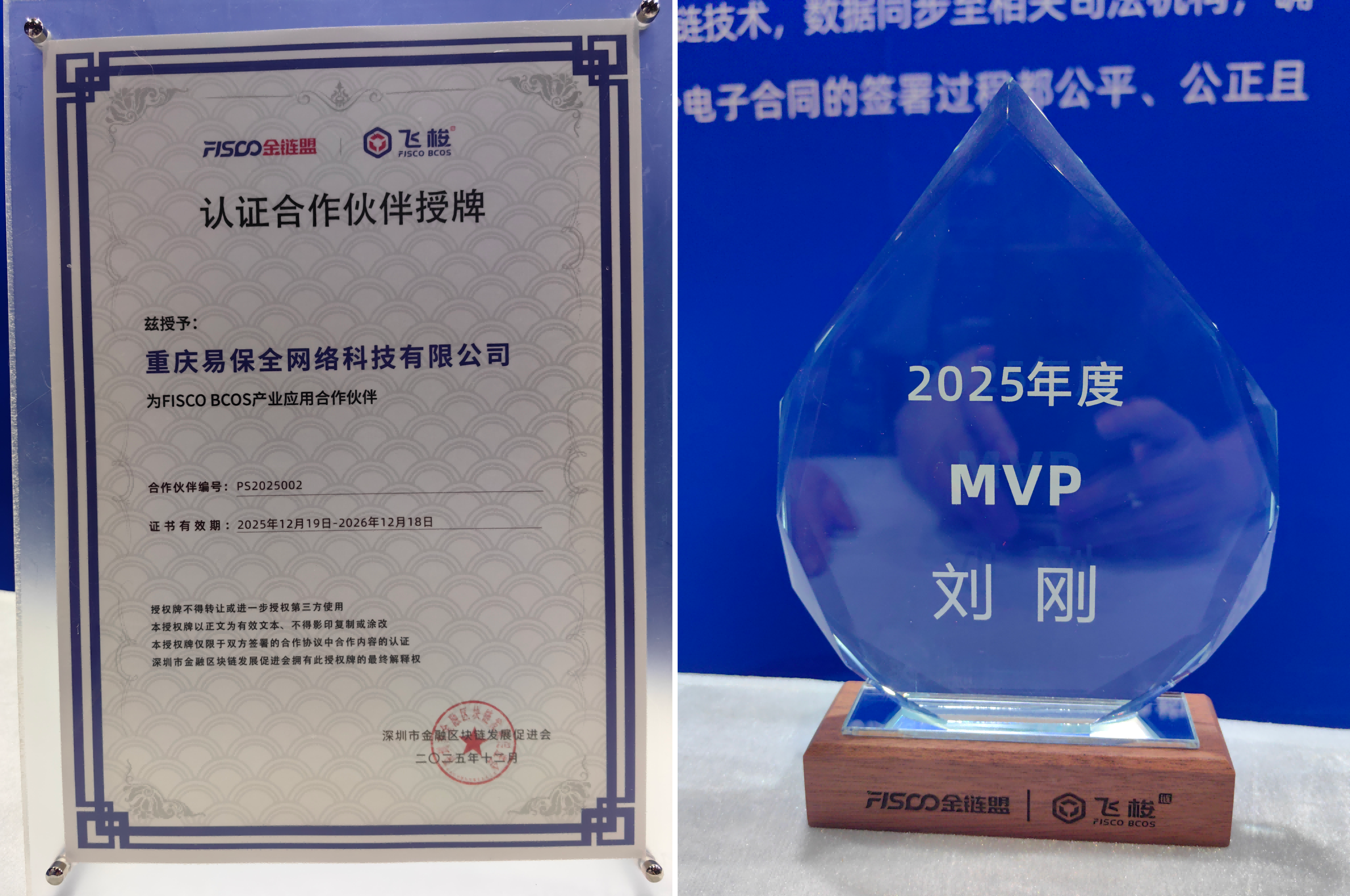 在本次大会的颁奖环节中,易保全董事长兼CEO刘刚先生被授予 “2025年度社区MVP” 称号,以表彰其在区块链技术与产业融合、开源生态共建方面的突出贡献。与此同时,易保全正式成为“FISCO BCOS产业应用合作伙伴” ,体现了其基于区块链底层的成熟应用成果与持续输出能力。这不仅是对易保全技术实力与商业化成效的肯定,更是对其坚持国产化、标准化、国际化发展路径的高度认可。