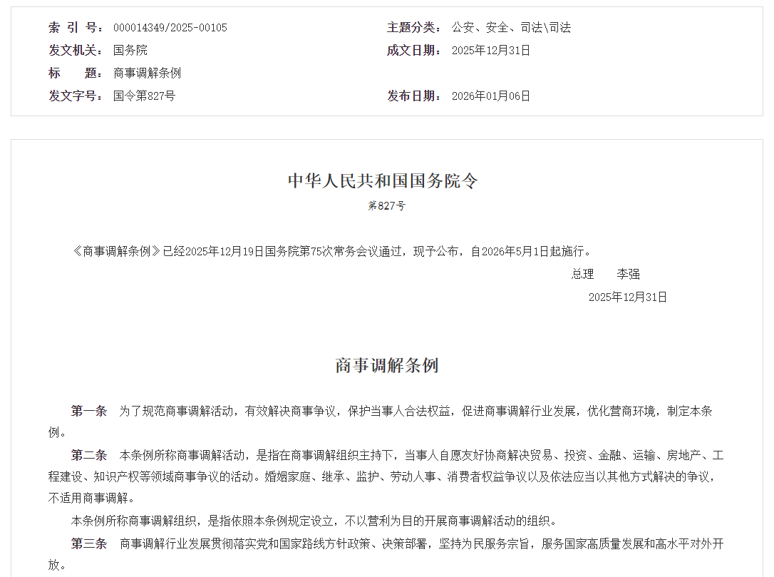 2025年12月31日,国务院总理李强签署国务院令公布《商事调解条例》(以下简称条例)自2026年5月1日起施行。该《条例》以“规范商事调解活动、优化营商环境”为核心目标,为商事争议解决机制注入法治动能,标志着我国商事调解制度建设迈入系统化、法治化的新阶段。